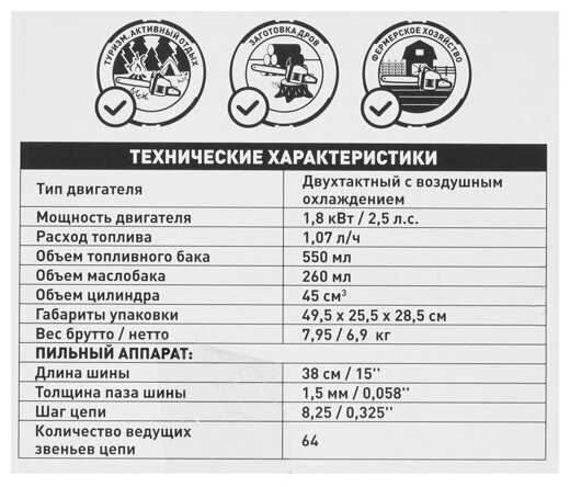| Комплект поставки : | бензопила, цепь, шина, чехол для шины, емкость для топливной смеси. ключ-отвертка, отвертка для регулировки карбюратора, ключ шестигранный, упор зубчатый с крепежом, инструкция |