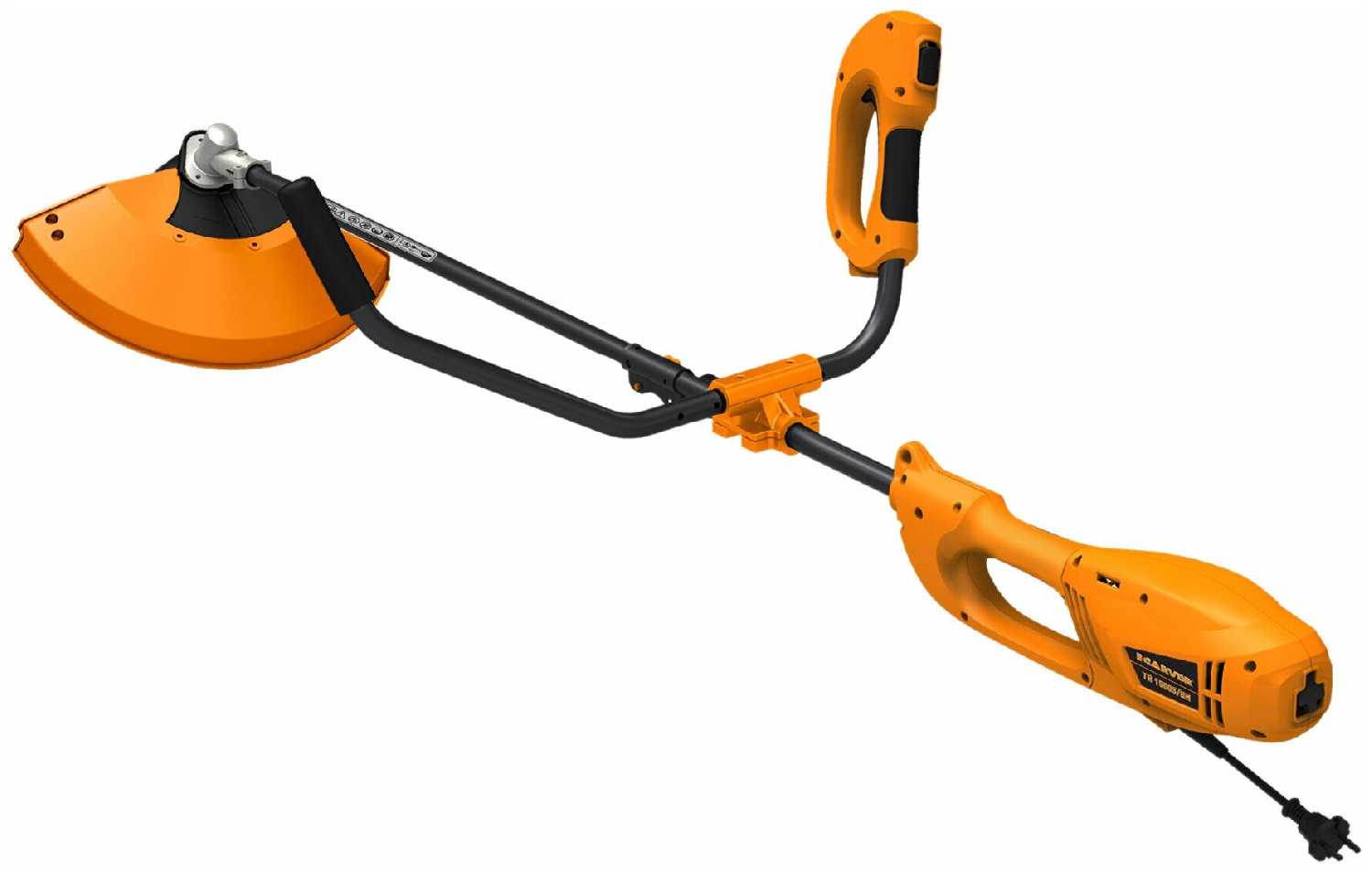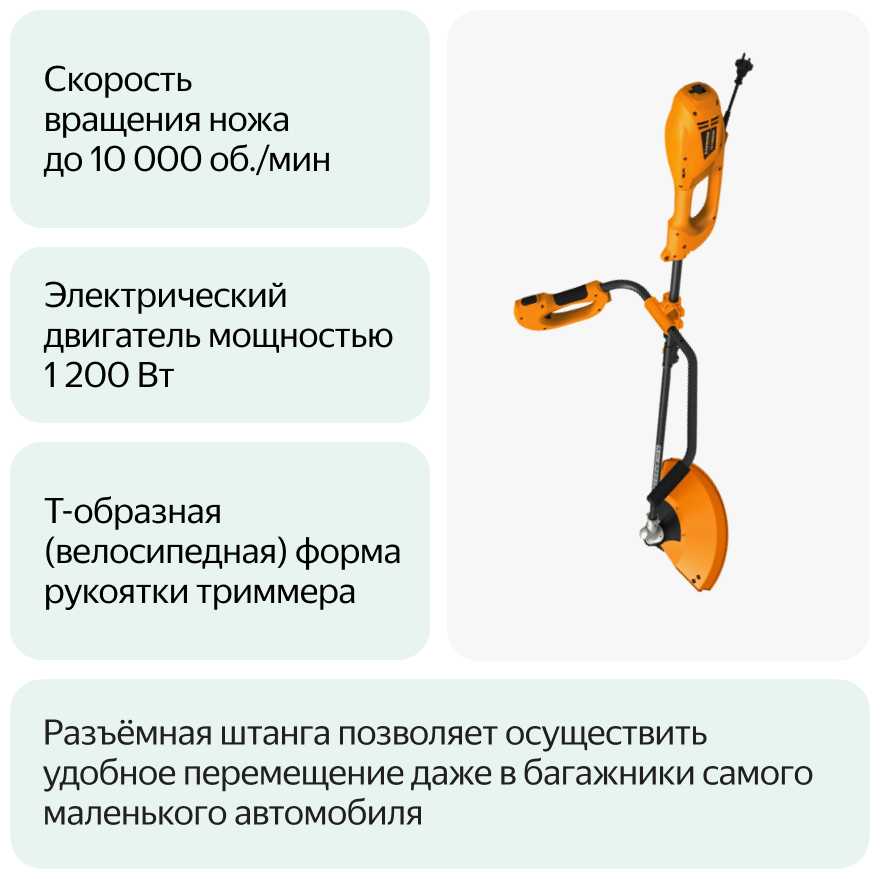 - Двигатель 1500 Вт уверенно срезает лопух, крапиву и молодую поросль диаметром до 1 см за один проход.