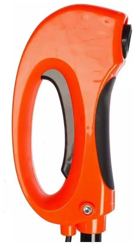 Велосипедная рукоятка — ключевое преимущество модели, позволяющее равномерно распределять нагрузку на обе руки и снижать утомляемость. Для пользователей ростом 170–180 см регулировка длины ремня и положения ручки на штанге делает работу комфортной, тогда как людям выше 185 см может не хватать длины штанги. Плечевой ремень из комплекта критикуют за ненадежный пластиковый фиксатор и склонность к скручиванию — многие заменяют его на аналог от бензиновых триммеров. Кнопка включения, расположенная под правую руку, удобна, но требует привыкания: из-за острого края некоторые пользователи испытывают дискомфорт при длительном удержании. Отдельно отмечают тихий плавный пуск, который исключает рывки при старте и упрощает контроль над инструментом.