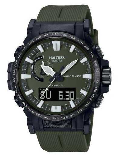 ударопрочность, солнечная батарея, радио-синхронизация, компас, термометр, высотомер (альтиметр), барометр, антимагнетизм, хронограф, таймер, будильник, индикатор запаса хода, мировое время, 12/24-часовое отображение времени