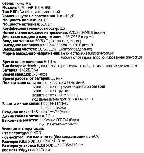 Особенности : | возможность замены батарей, встроенный сетевой фильтр, звуковая сигнализация, фильтрация помех, холодный старт |