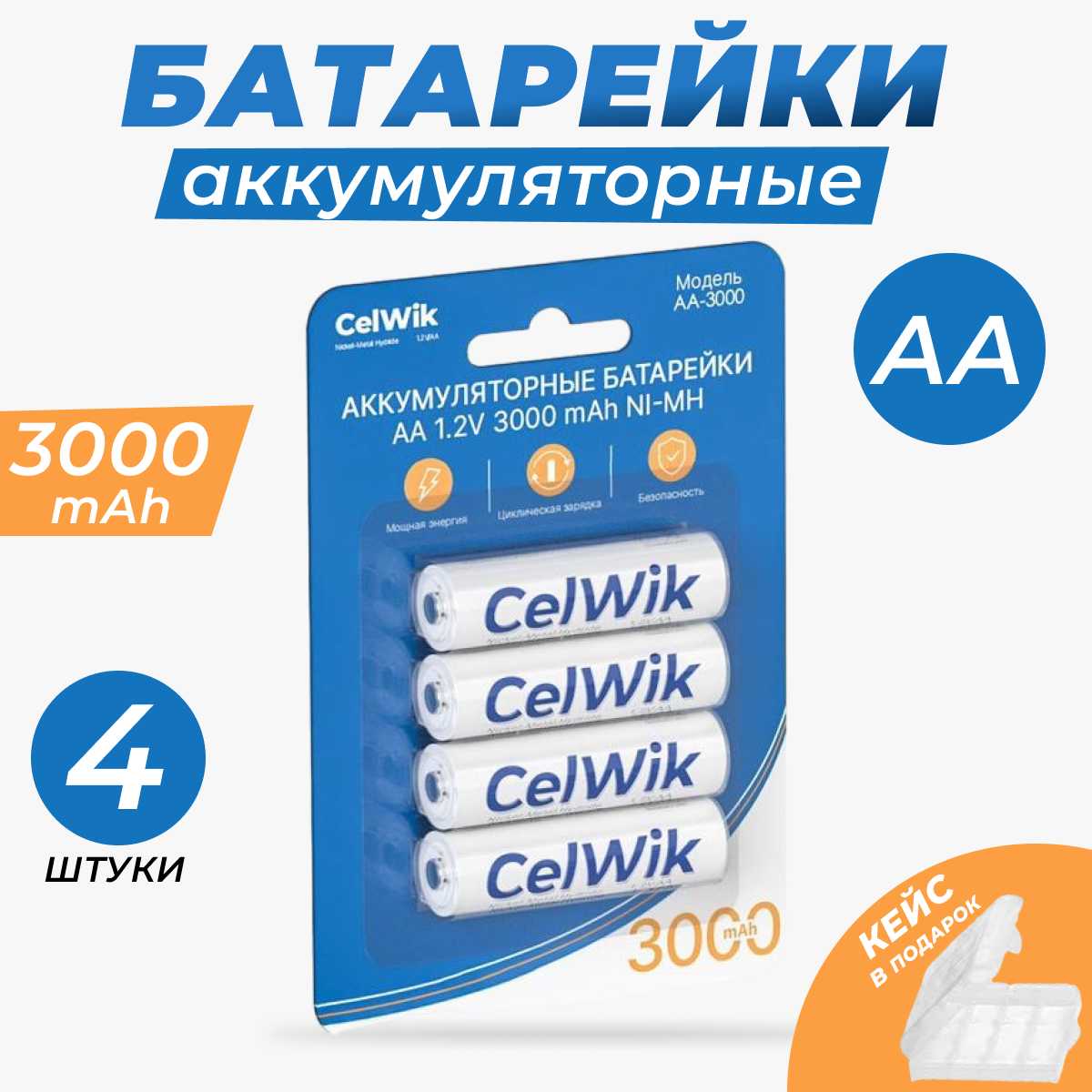 Отлчные Аккумуляторные батарейки CelWik типа АА 3000 mAh, 1,2 V 4 шт ( Пальчиковые ) Ni-MH + Кейс. Всем рекомендую данныйе Аккумуляторные батарейки. Покупайцте- не пожалеете!