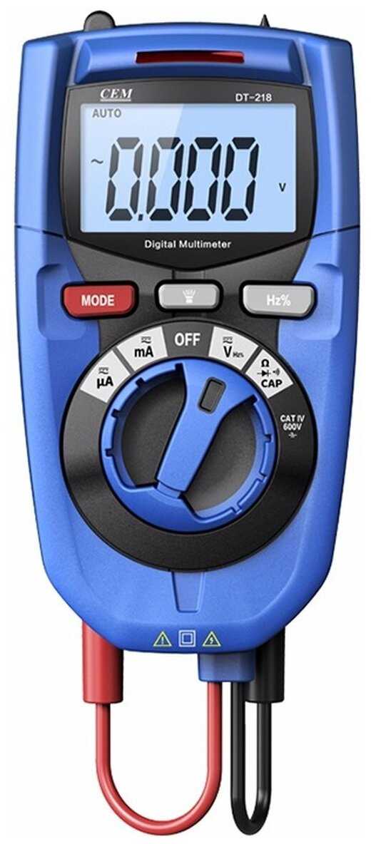 | Особенности : | автоматический выбор диапазона измерений, автоматическое выключение, подсветка дисплея, фиксация измерений, фонарик |