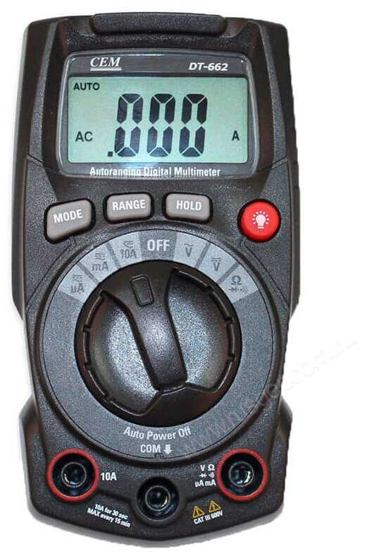 | Особенности : | автоматический выбор диапазона измерений, автоматическое выключение, подсветка дисплея, фиксация измерений |