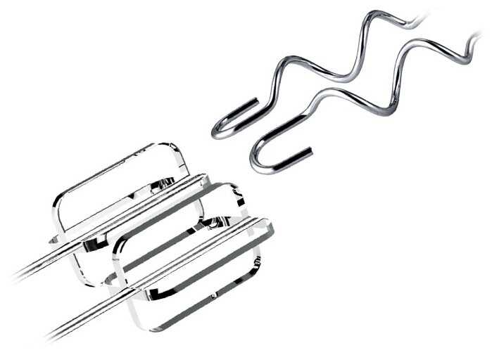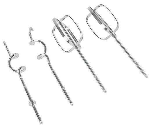 - Венчики и крюки достают до дна высоких мисок, что предотвращает разбрызгивание.