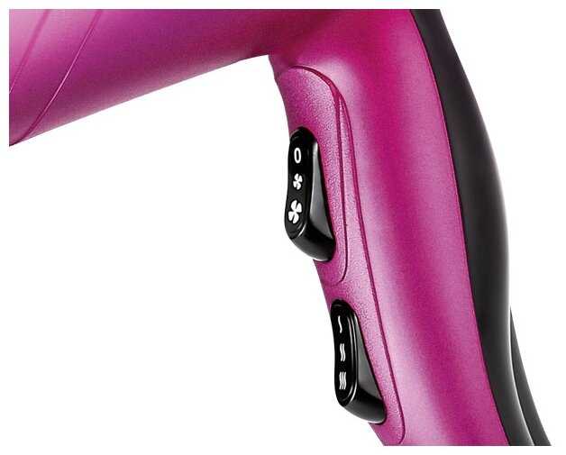 Отличная стильная модель фена. Эргономичная ручка позволяет удобно управлять феном. Ручка имеет противоскользящие вставки, поэтому фен надежно лежит в руке. Две клавиши на ручке дают возможность менять режимы сушки одни движением пальца. Фен имеет раскраску цвета фуксия с черным. В комплекте есть одна насадка.