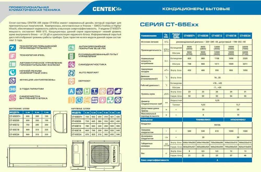 | Дополнительная информация : | Наши кондиционеры имеют неповторимый дизайн, который поможет вам идеально вписать нашу продукцию в интерьер вашего помещения. Огромное разнообразие моделей позволит сделать верный выбор. Компрессор HIGHLY Компрессоры, которые мы устанавливаем на наши сплит-системы, имеют огромный ресурс работы благодаря высочайшему качеству производства. Выбирая наши кондиционеры, Вы выбираете качество и надежность. Низкий уровень шума Благодаря грамотному проектированию всех комплектующих сплит-систем Centek-Air, мы добились максимально тихой работы для нашей продукции. Наши кондиционеры не смогут потревожить даже самый чуткий сон. Премиальная матовая поверхность Выбирая наши кондиционеры, Вы можете не переживать, что через некоторое время корпус потускнеет. К тому же такой материал поглощает солнечный свет и не бликует. Режим Sleep Режим Sleep приносит пользу для здоровья, исключая направленные потоки воздуха, а также предотвращает нерациональный расход электроэнергии в ночное время. Инновационная система самоочистки «Self-cleaning Plus» Инновационная система самоочистки «Self-cleaning Plus» обеспечивает комплексную глубокую очистку как внутреннего, так и наружного блока кондиционера. Технология «Progressive inverter» Технология «Progressive inverter» позволяет кондиционеру при работе на минимальных оборотах потреблять всего 45 Ватт. Это существенно уменьшит расходы на электроэнергию. Работа в широком диапазоне напряжения Работа в широком диапазоне напряжения (120-260 В) позволяет увеличить срок службы сплит-системы. Вы можете не переживать из-за резких перепадов напряжения электроэнергии. Облегченный доступ для обслуживания сплит-системы Нижняя съемная планка позволяет обеспечить доступ к соединениям без демонтажа внутреннего блока. Это существенно облегчает обслуживание сплит-системы. Бионический дизайн направляющих лопастей После многочисленных исследований нашими инженерами был выбран бионический дизайн направляющих лопастей, которые повторяют контуры листа. Это позволило значительно снизить уровень шума. Работа на обогрев до -20 oC Сплит-системы способны работать даже при низкой температуре окружающей среды. Данная линейка моделей способна работать на обогрев вплоть до -20 oC. |
