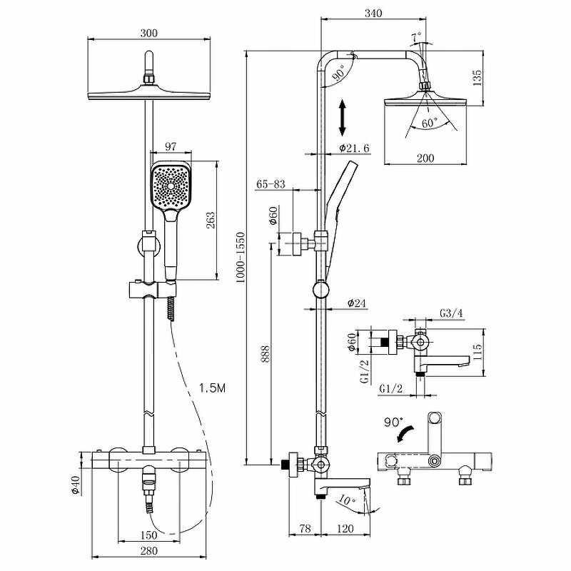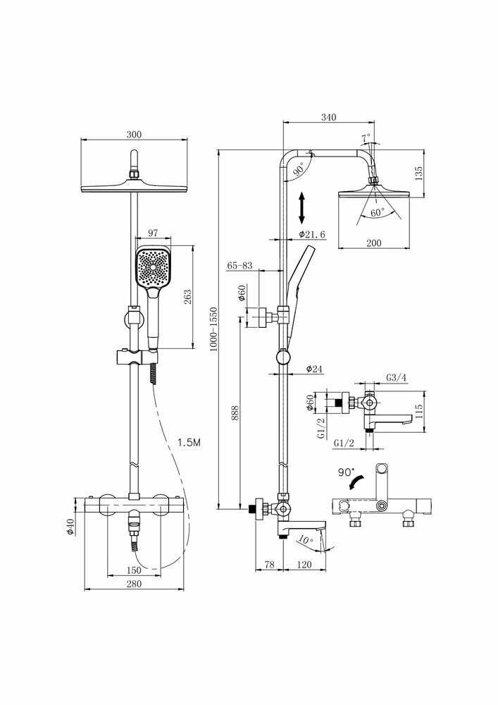 | Комплектация : | верхний душ, держатель лейки, душевая штанга, излив для набора воды, лейка, ручной душ, смеситель, шланг |