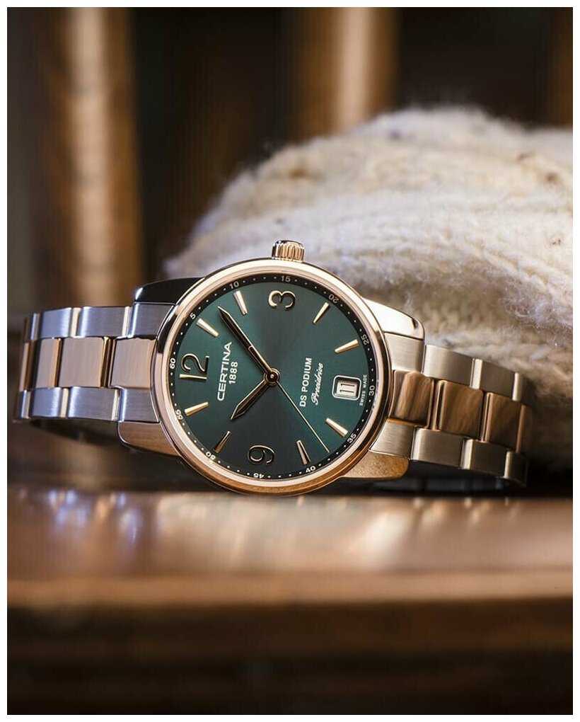 - + Сertina как всегда на уровне, цвет циферблата изумрудный, стрелочки и цифры золотые, очень достойно и красиво.