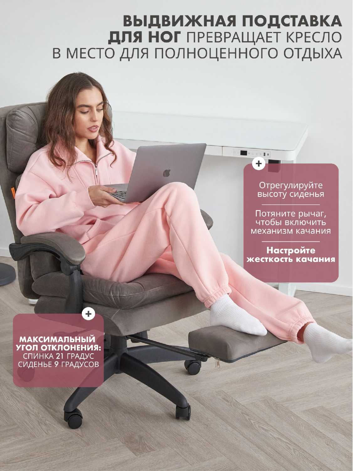 - + Кресло удобное, обивка из качественного велюра приятная на ощупь и хорошо гармонирует с обстановкой в комнате. Сборка проходит без особых усилий, всё просто и быстро. Порадовала возможность настроить наклон спинки в зависимости от веса пользователя.