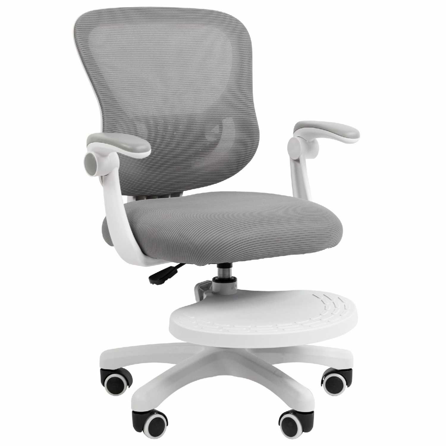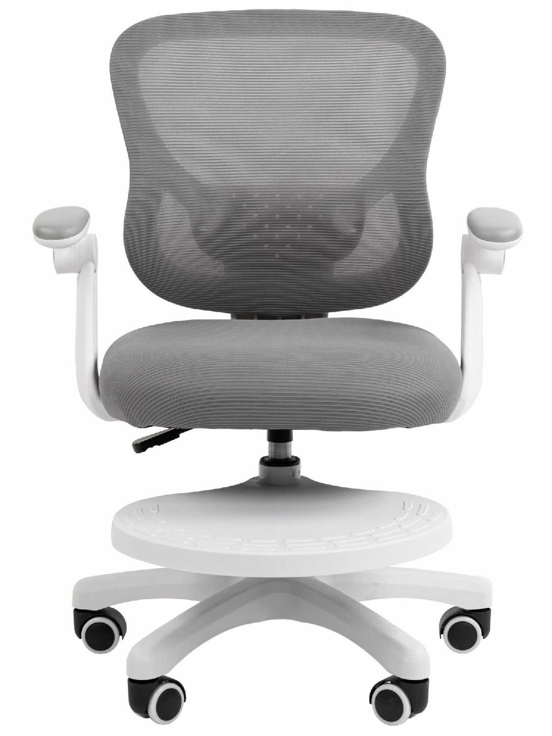 Газлифт адаптирует высоту под рост, подножка регулируется по длине, а подлокотники откидываются для комфортного придвигания к столу. Эргономичная спинка с поясничной поддержкой учитывает анатомические различия, обеспечивая персонализированный комфорт. -