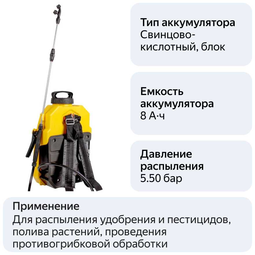 - Технический параметр: производительность насоса обеспечивает высокую скорость обработки — теплица или сад опрыскиваются в разы быстрее ручных моделей.