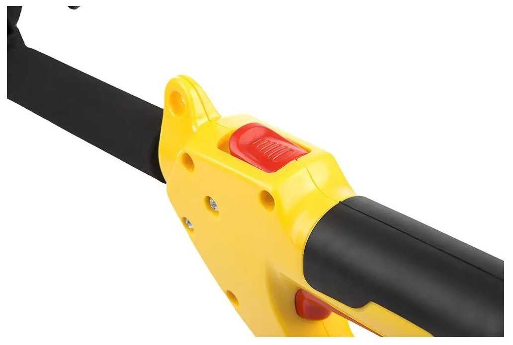 - Кнопка включения с плавным пуском набирает обороты до 7500 об/мин постепенно, предотвращая рывки и повышая безопасность на неровной местности.