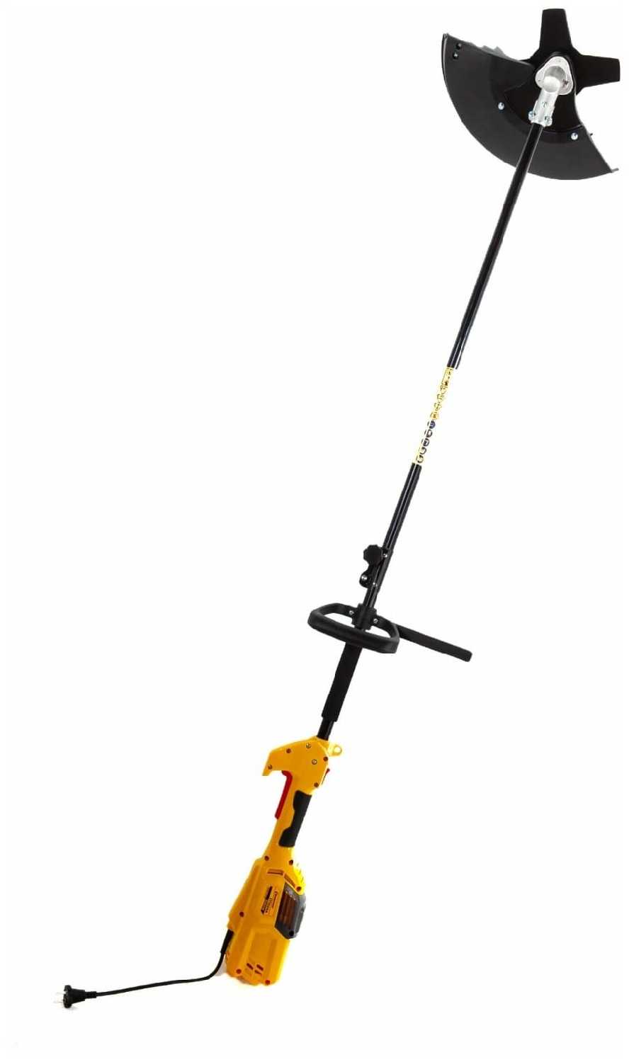 - Мелочь косит леской, крупное — ножом, что ускоряет обработку сада и зазора за забором.