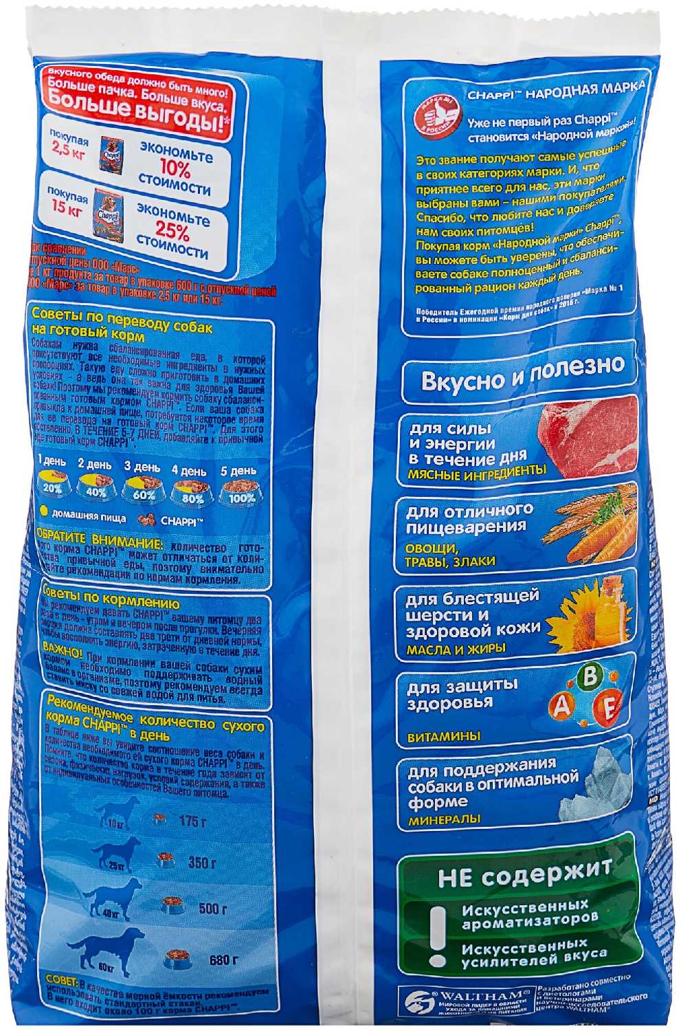 - Отмечены "крупные фракции" гранул, что удобно для средних/крупных собак и может способствовать очищению зубов.