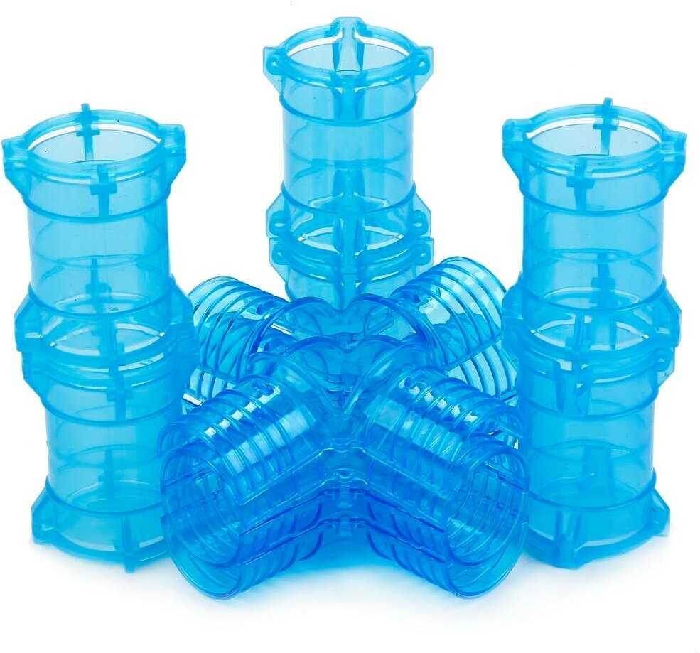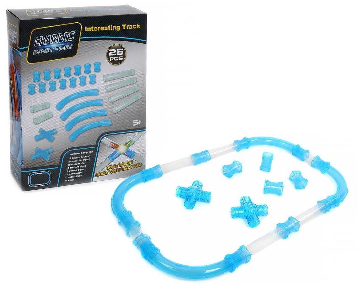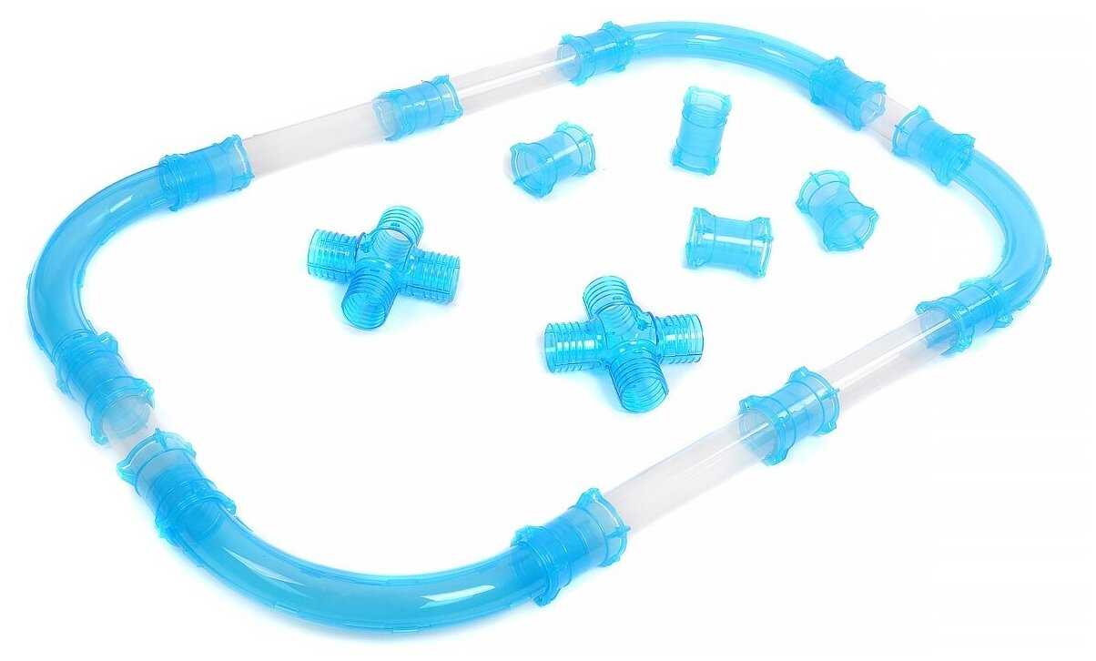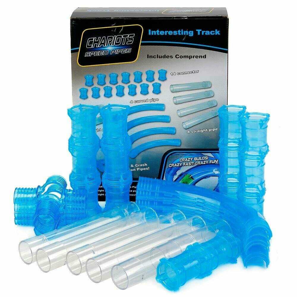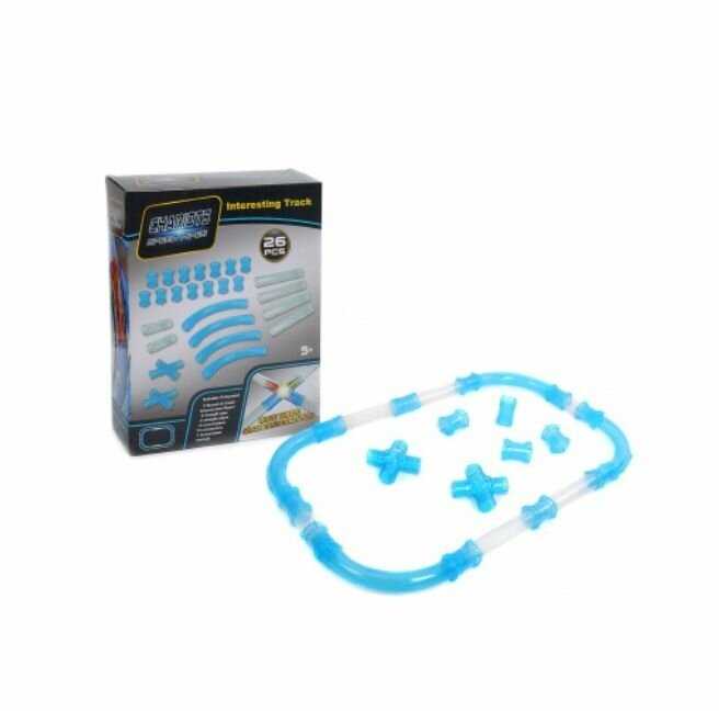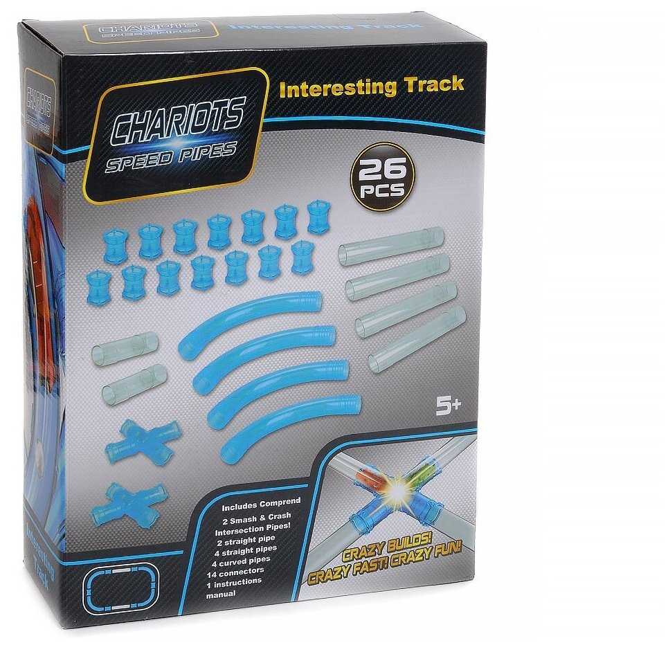 - прямой участок трубки (короткие) - 2 шт, - прямой участок трубки (длинные) - 2 шт, - изогнутый участок трубки - 4 шт, - соединительные муфты - 14 шт, - участок для запуска машинки - 2 шт, - детали перекрестка - 2 шт. |