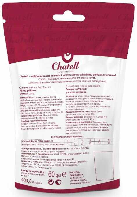 Характеристи Chatell Лакомство для кошек подушечки для ухода за зубами (60г)