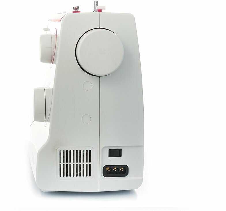 Слева нижняя часть рабочего столика снимается, удобно для обработки рукавов. В съёмную часть прячу дополнительные лапки, иглы и аксессуары для шитья. Корпус пластиковый, сама станина металлическая, машинка весит прилично 6,2 кг. Изготовлена во Вьетнаме. Челнок вертикального типа, все элементы тоже из металла. Игловодитель зафиксирован плотно. Есть ручка для переноски (пластиковая, я бы ей не доверяла) и простой защитный чехол. Педаль удобна в использовании. Питается от обычной розетки 220 В.