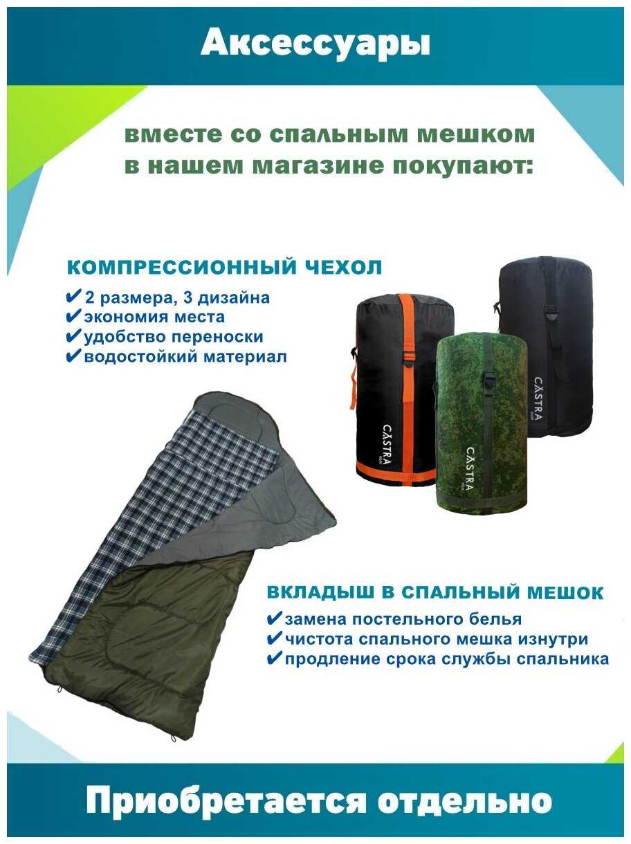 Спальник неплохо сжимается в стороннем компрессионном мешке с размерами 75*35 . Я купил модель Castra XXL. В этот спальник на сплаве в морозные майские праздники поместились 2 ребенка 3 и 8 лет в декатлоновских детских спальниках и их мама мерзлячка в приличном триаловском спальнике 450XL - на тесноту и холод не жаловались)