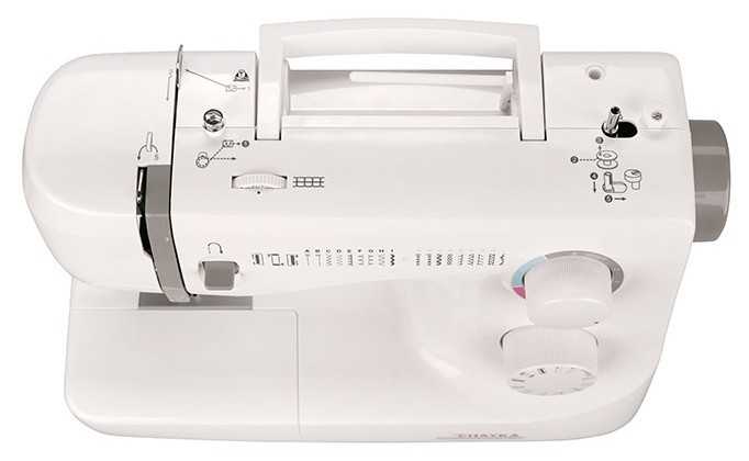 - + супер-машинка, много функций стежка, полуавтоматическая заправка нити.