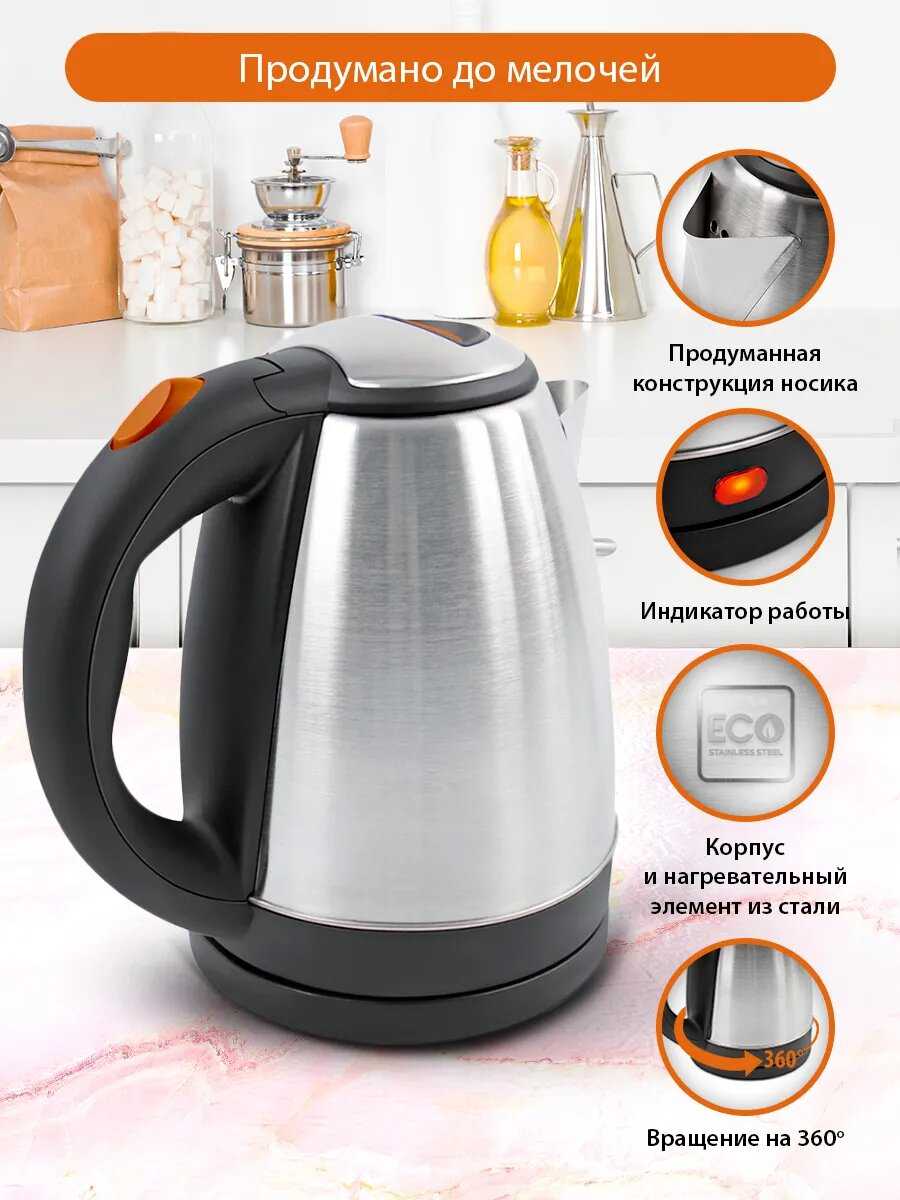 Характеристики:- объем 1.7 л мощность 1800 Вт индикация включения закрытая спираль установка на подставку в любом положении стальной корпус