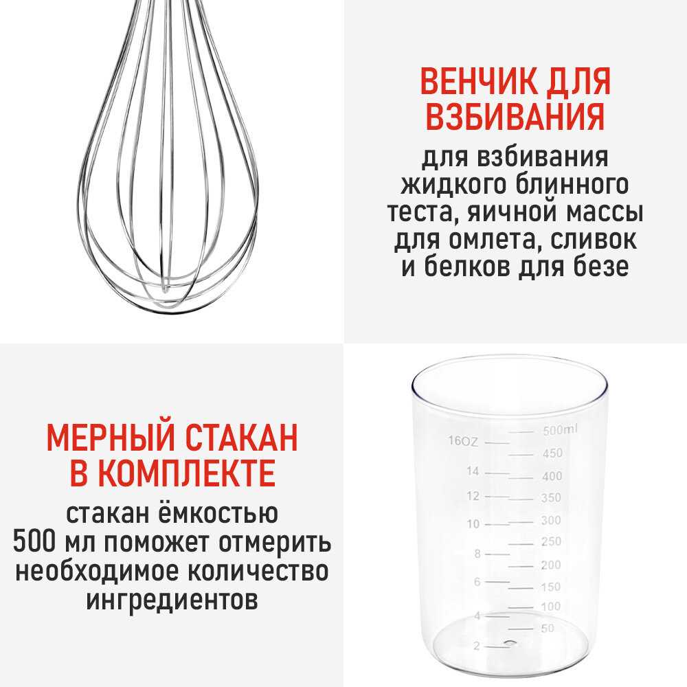 В комплекте предусмотрен стакан объемом 500 мл с четкой градуировкой, подходящий для смешивания соусов или малых порций теста. Его дно устойчиво, предотвращая скольжение, а форма оптимизирована под работу насадок. Материал — прочный пластик, хотя в единичных случаях отмечались трещины при падении. Стакан можно использовать отдельно для хранения насадок на подставке. -