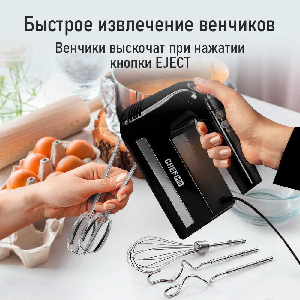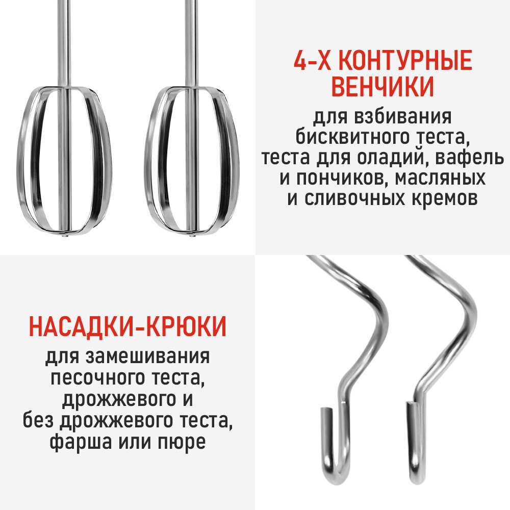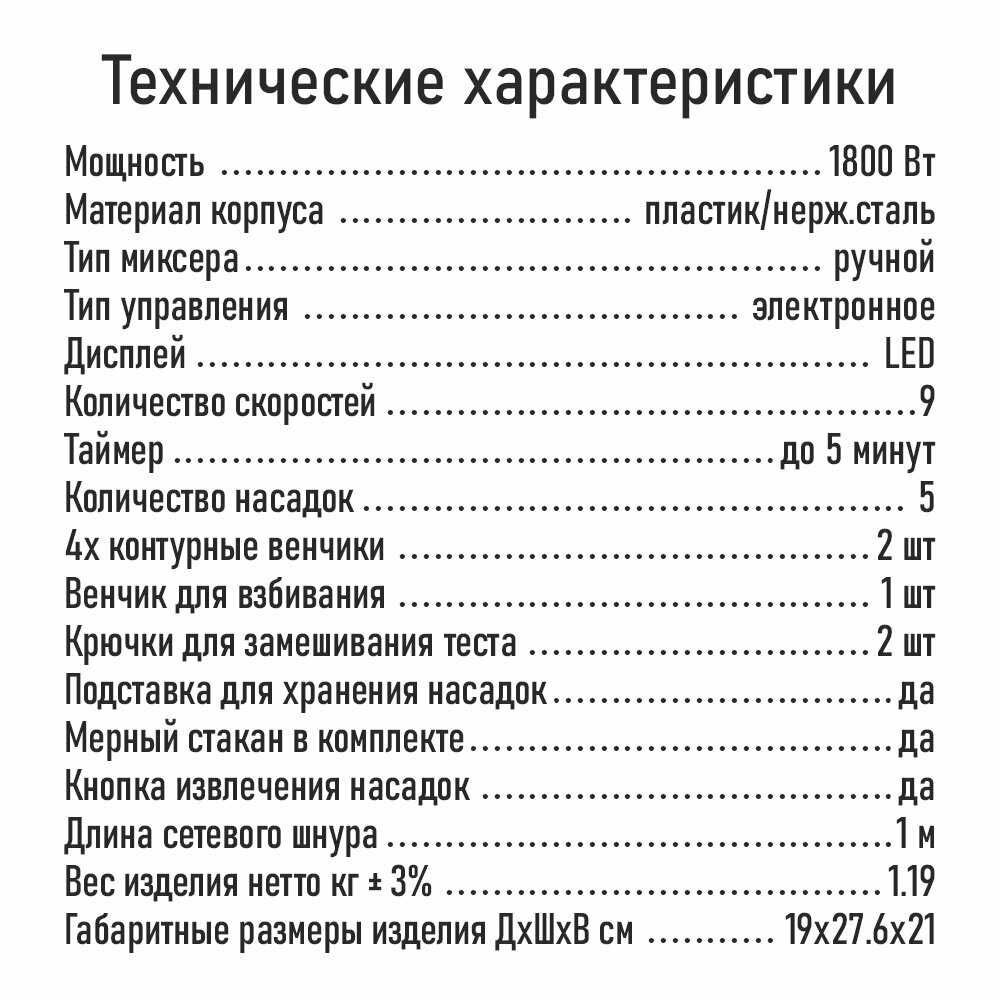- Три комплекта насадок (венчики, крюки) позволяют адаптировать миксер к задачам разной сложности, от взбивания кремов до замеса плотного теста.