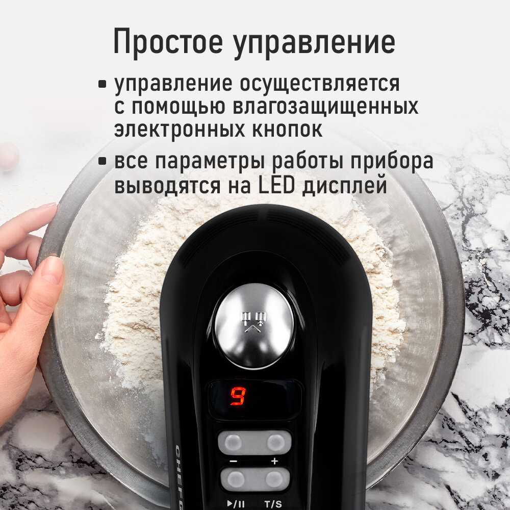 Электронная система управления с 9 скоростными режимами обеспечивает точную настройку интенсивности обработки продуктов, хотя мелкий размер кнопок требует привыкания. Таймер с автоматическим отключением через 5 минут ограничивает непрерывную работу, что критично для рецептов с длительным циклом взбивания. Эргономика ручки получила положительные оценки – вес распределен сбалансированно (не чрезмерно легкий, но и не тяжелый), форма обеспечивает комфортный захват при продолжительном использовании. Отмечена эффективная конструкция съемного механизма насадок: венчики и крюки фиксируются надежно, а их замена выполняется нажатием одной кнопки. Недостатком признан короткий сетевой шнур, ограничивающий мобильность прибора на кухне. Дисплей без заводской пленки у отдельных экземпляров указывает на возможное использование устройства до продажи.