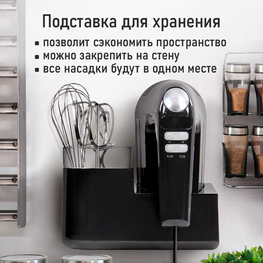 Стандартная комплектация включает три комплекта насадок: венчики для взбивания, крюки для теста и основные насадки для смешивания. Дополнительный венчик особенно ценится за быстрое взбивание яиц или кляра. Насадки легко снимаются и моются, хотя некоторые пользователи отмечают ненадежное крепление тонкого венчика. Для хранения предусмотрена подставка, сохраняющая порядок на кухне. -