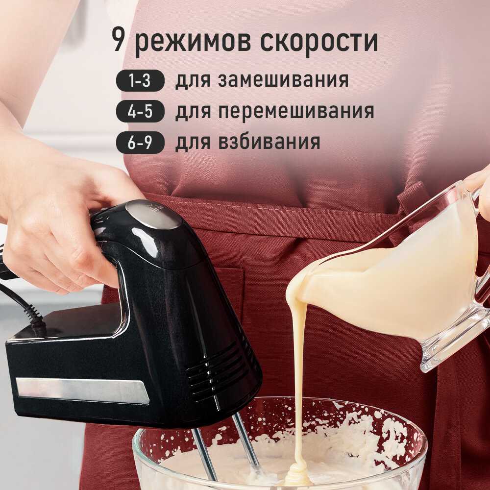- Автоматическое отключение через 5 минут прерывает процессы взбивания, требующие больше времени (меренги, плотные кремы).