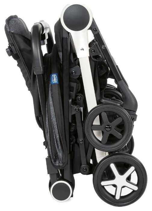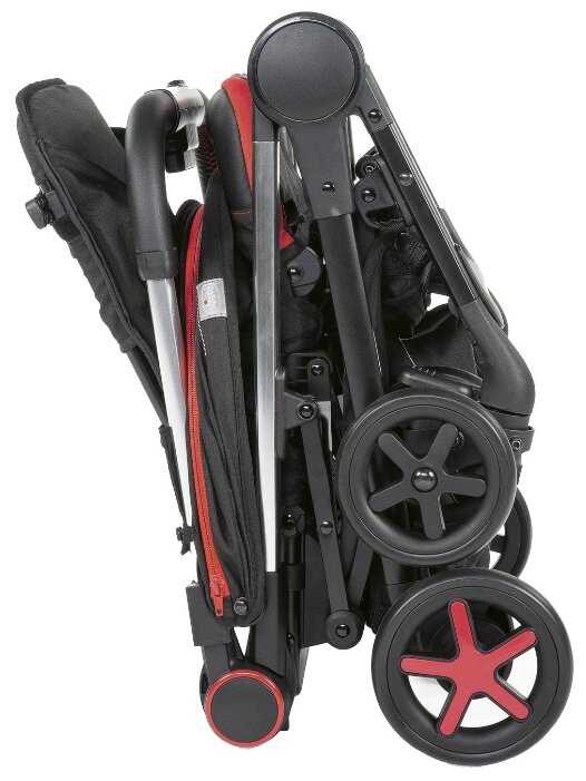 - Коляска складывается одной рукой в компактный размер, напоминающий книгу, что удобно для хранения в багажнике или переноски в самолёте.