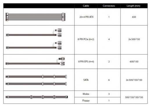 - Длина кабеля CPU 8-pin (65 см) и 24-pin (55 см) подходит для корпусов Mid-Tower с нижним расположением БП.