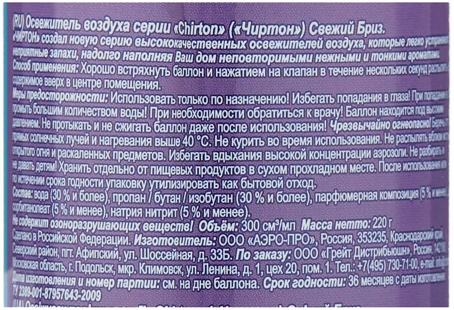 | Дополнительная информация : | ту 2389-001-87957643-2009, способы применения: хорошо встряхнуть баллон несколько раз нажать на клапан и в течение нескольких секунд распылить освежитель в воздух направив струю аэрозоля вверх и в разные стороны внимание при распылении следует избегать попадания аэрозоля на стены и на предметы интерьера баллон при распылении не переворачивать, меры предосторожности: использовать только по назначению осторожно воспламеняется не распылять вблизи открытого огня и раскаленных предметов предохранять от воздействия прямых солнечных лучей и нагревания выше +40 °c баллон под давлением не вскрывать и не сжигать баллон даже после использования не допускать попадания в глаза при попадании в глаза немедленно промыть их чистой водой при необходимости обратиться к врачу избегать попадания на кожу не вдыхать не глотать беречь от детей хранить отдельно от пищевых продуктов в сухом прохладном месте недоступном для детей после использования или по истечении срока годности баллон утилизировать как бытовой отход |
