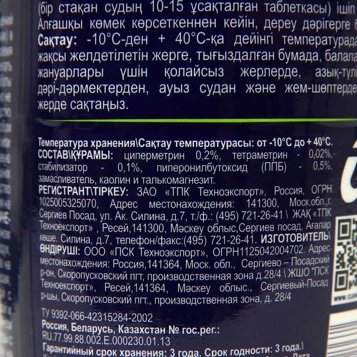 Состав : | циперметрин-0, 2%, тетраметрин-02, пиперонилбутоксид-0, 5%, стабилизатор, каолин, пищевые атрактанты |