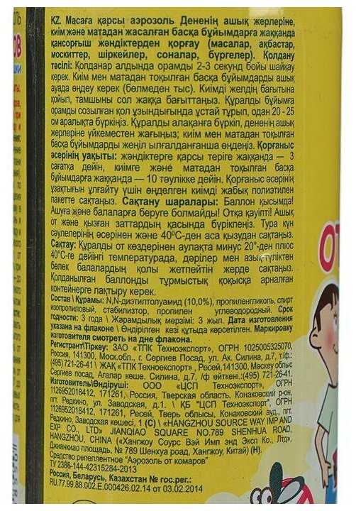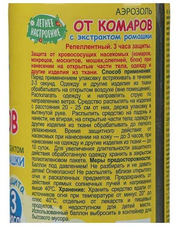 Дополнительная информация : | время защитного действия при нанесении на одежду - до 30 суток, не оставляет жирных следов на одежде, с экстрактом ромашки |