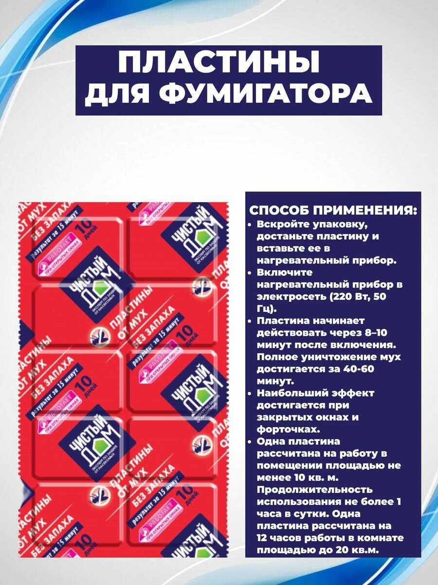 | Способ применения : | вскройте упаковку достаньте пластину от мух “Чистый Дом” и вставьте ее в нагревательный прибор, включите нагревательный прибор в электросеть (220 Вт 50 Гц), пластина начинает действовать через 8–10 минут после включения, полное уничтожение мух достигается за 40-60 минут, наибольший эффект достигается при закрытых окнах и форточках |