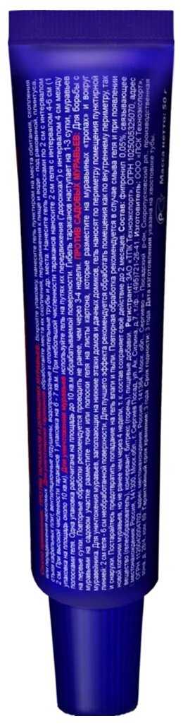 | Дополнительная информация : | Для предотвращения появления муравьев в домах и дачных домиках, наносите гель по периметру помещения пунктирной линией: 2 см геля с интервалом 6 см необработанной поверхности |