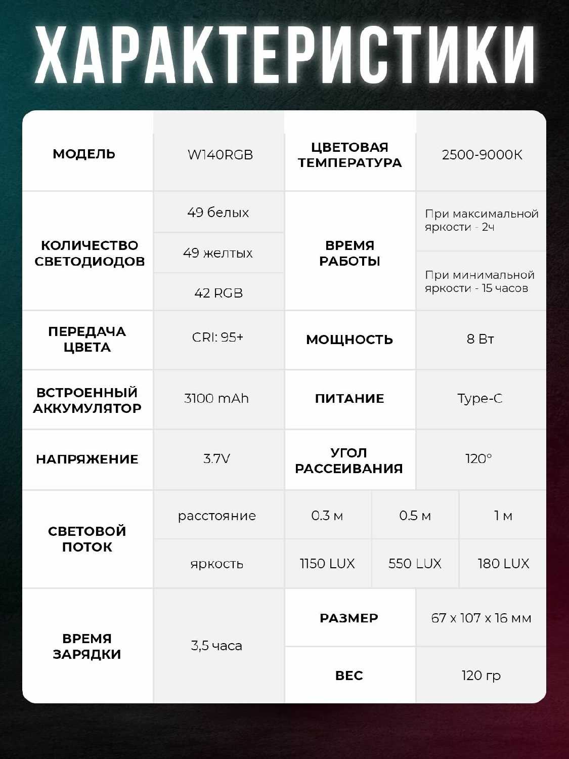 Состав набора : | 1. Подсветка - 1 шт, 2. Зарядка - 1 шт, 3. Инструкция - 1 шт. |