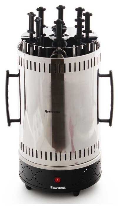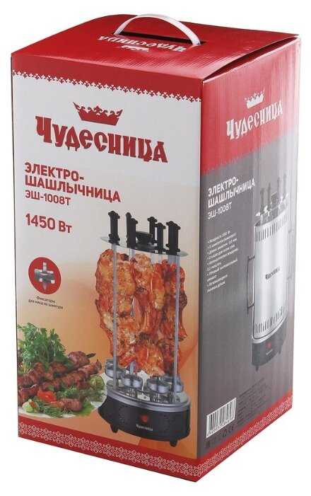 вместительность 8 шампуров, автоматическое вращение, фиксаторы мяса, мощность 1450 Вт, съемные чашки для жира, универсальность, безопасность использованияОбзор Чудесница ЭШ-1008T - мнение пользователей*: