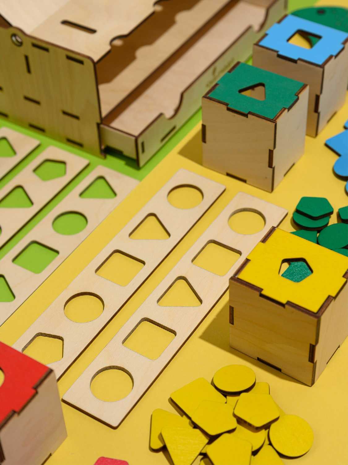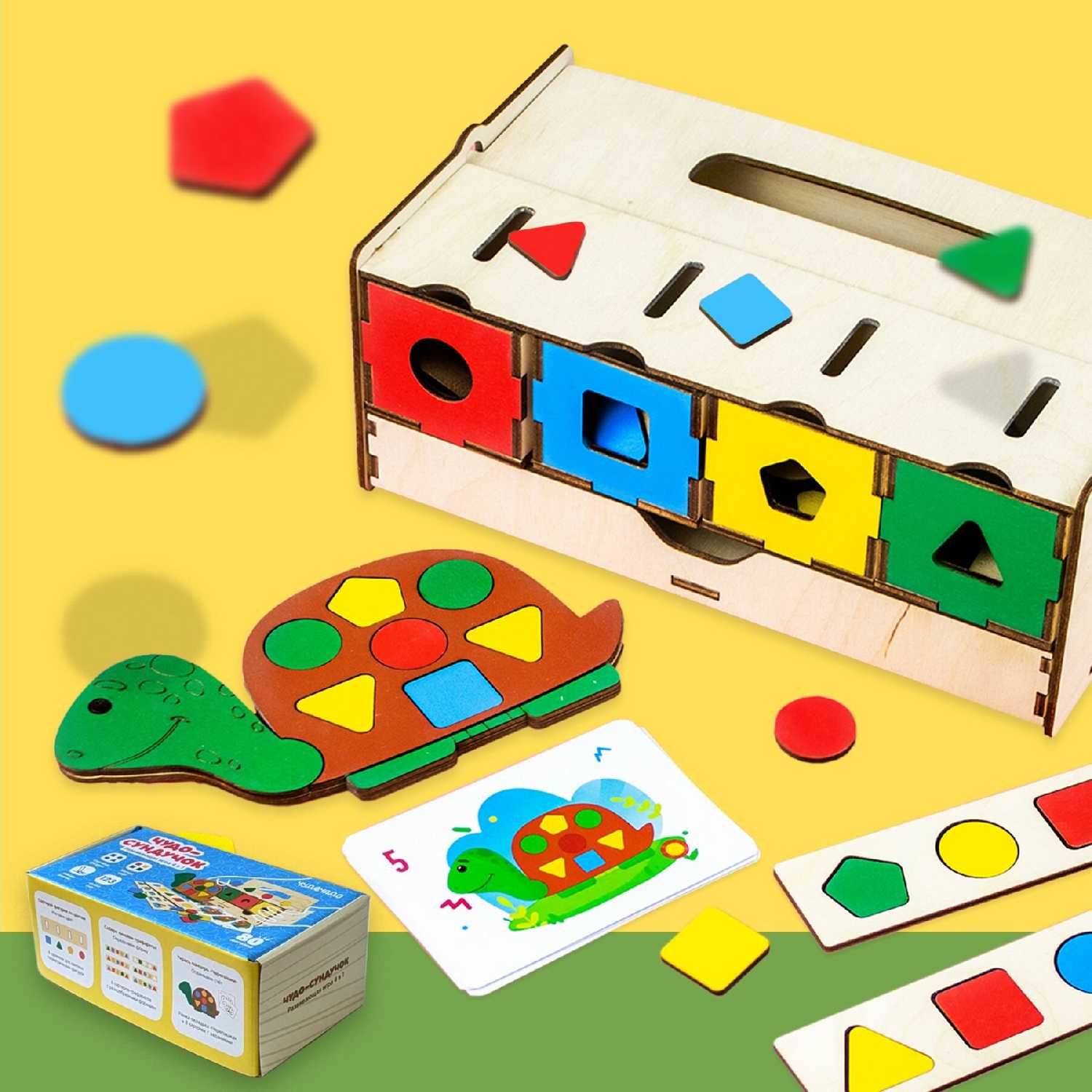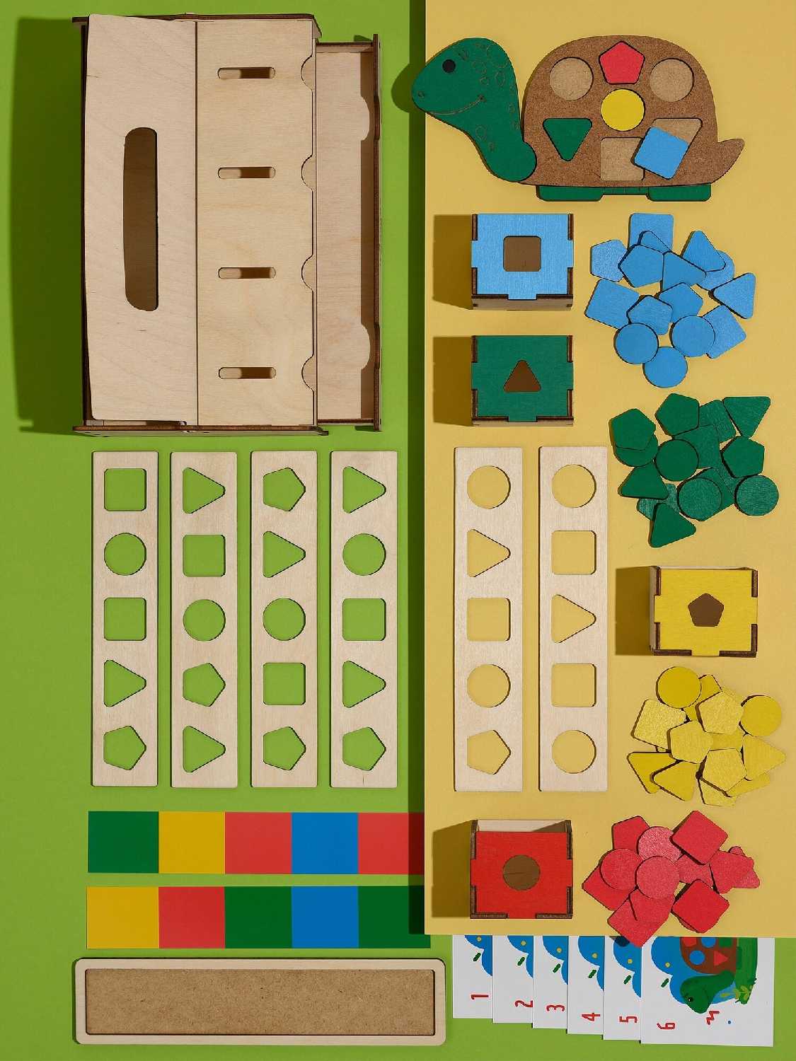 Комплектация : | Геометрические фигурки - 64 шт Деревянный сундучок-сортер - 1 шт Цветные коробочки для сортировки - 4 шт Иллюстрированные карточки для игры - 9 шт Сортер Черепашка - 1 шт Рамки для сортировки по форме - 6 шт |