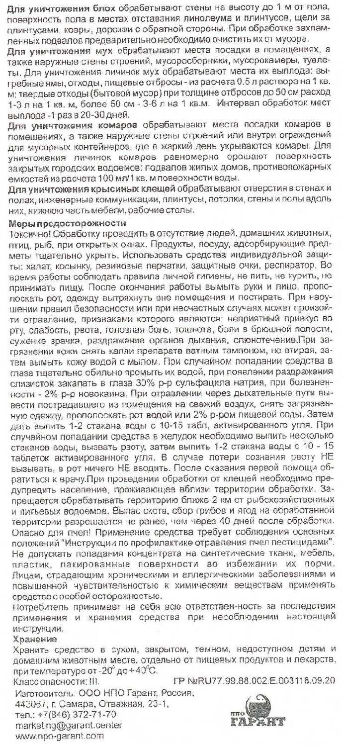 Способ применения : | Средство необходимо развести с водой в пропорциях: иксодовые клещи: 125 мл на 1 литр, тараканы: 4 мл на 1 л, клопы муравьи мухи: 2 мл на 1 л, блохи комары крысиные клещи: 1 мл на 1 л. С помощью любого опрыскивателя обработать места обитания насекомых. 100 мл средства достаточно для обработки 10 соток дачного участка. Соблюдайте меры предосторожности. |