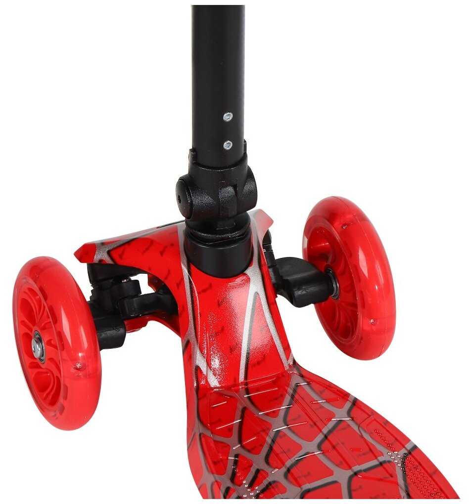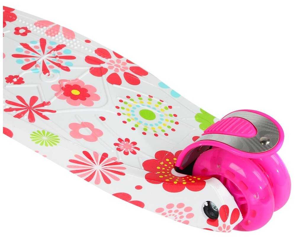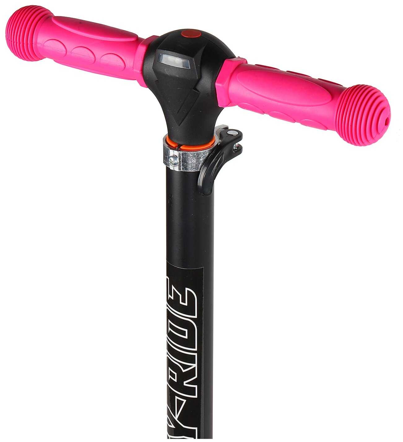 - + Самокат недорогой, прочность на приемлемом уровне. Есть фонарик, светящиеся колеса, хорошие грипсы