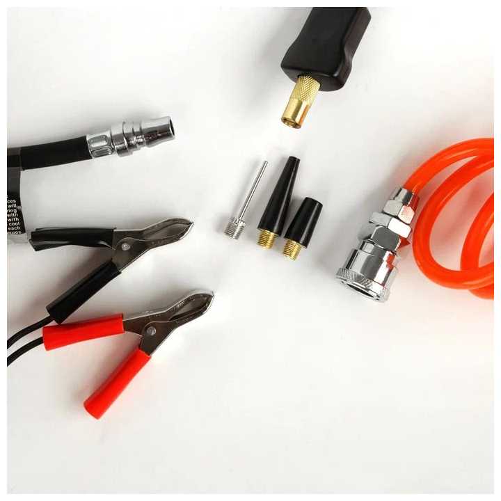 - - Производители явно сэкономили на проводах подключения к источнику питания-мало того, что это только крокодилы на клеммы аккумулятора, так и накачать колеса реально наверное на "Оке", такие они короткие. Отдельный удлиняющий оранжевый шланг для подачи воздуха в колеса оказался с браком- одна концевая фишка...