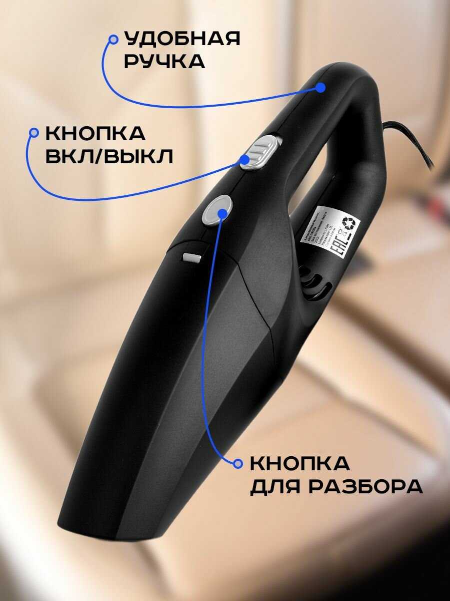 - Небольшие габариты и вес (≈1.5 кг) позволяют легко чистить салон автомобиля, включая узкие пространства под сиденьями.