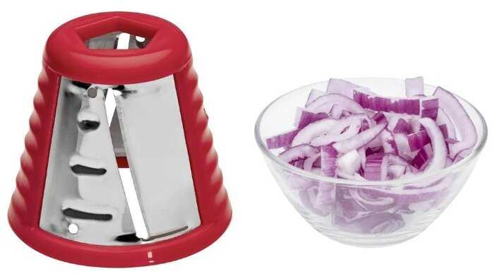 - - Есть приставка для нарезки кружочком,но вход узкий огурец,морковка,картошка не проходят застревают, трёт только вареное и мягкое,пластиковые комплектующие очень хрупкие,после 3 раз использования поя вились трещины.