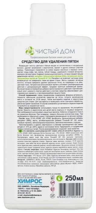 | Способ применения : | перед применением содержимое флакона встряхнуть. Нанесите небольшое количество средства на пятно, потрите загрязненное место и оставьте на 15-30 минут, после выстирайте изделие с вашим привычным средством для стирки. Для застарелый и въевшихся пятен повторите обработку увеличив время, нанесения |
