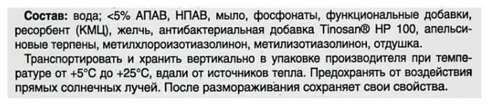 | Состав : | вода, <5% АПАВ НПАВ мыло фосфонаты функциональные добавки ресорбент (КМЦ) желчь антибактериальная добавка Tinosan® HP 100 апельсиновые терпены метилхлороизотиазолинон метилизотиазолинон отдушка. |