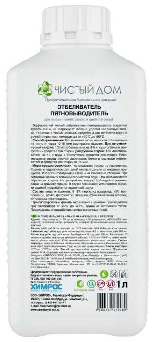 | Дополнительная информация : | состав: вода очищенная, 5-15% пероксид водорода, <5% изопропанол, АПАВ, фосфонаты, глицерин, функциональная добавка, оптический отбеливатель |