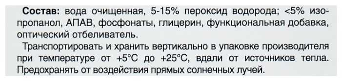 | Состав : | Вода очищенная, 5-15% пероксид водорода, <5% изопропанол, АПАВ, фосфонаты, глицерин, функциональная добавка, оптический отбеливатель |