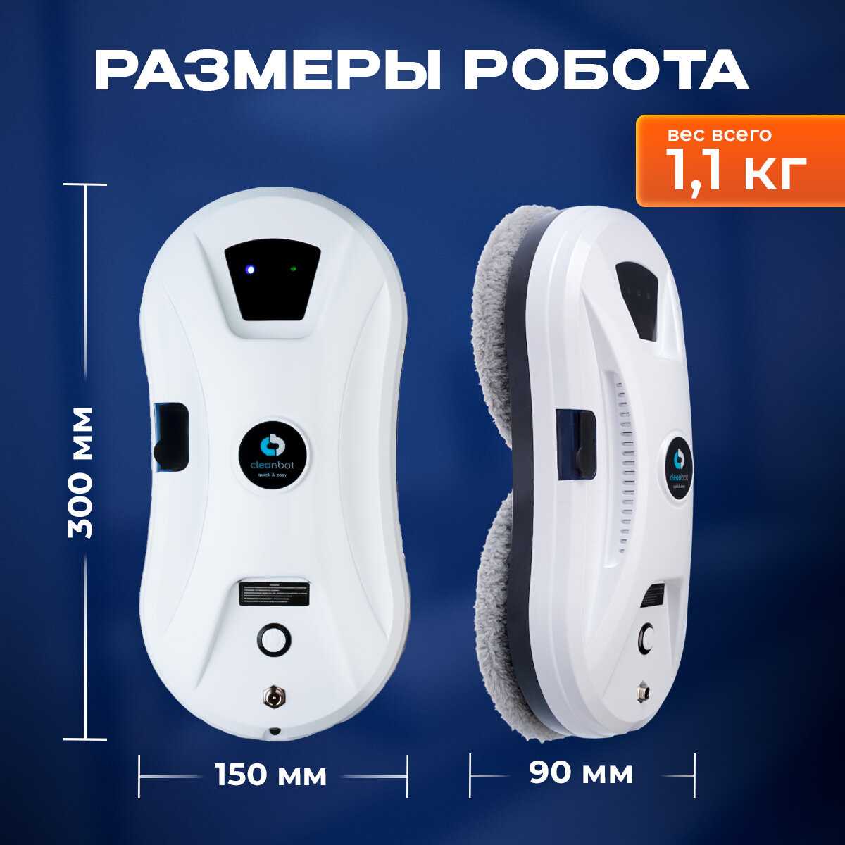 Сетевой шнур и страховочный трос имеют достаточную длину для работы на окнах высотой более 3 метров. Пульт дистанционного управления уверенно работает на расстоянии до 10 метров через две комнаты. При работе с внешней стороны окна может потребоваться найти оптимальный угол для передачи сигнала к датчикам робота. -